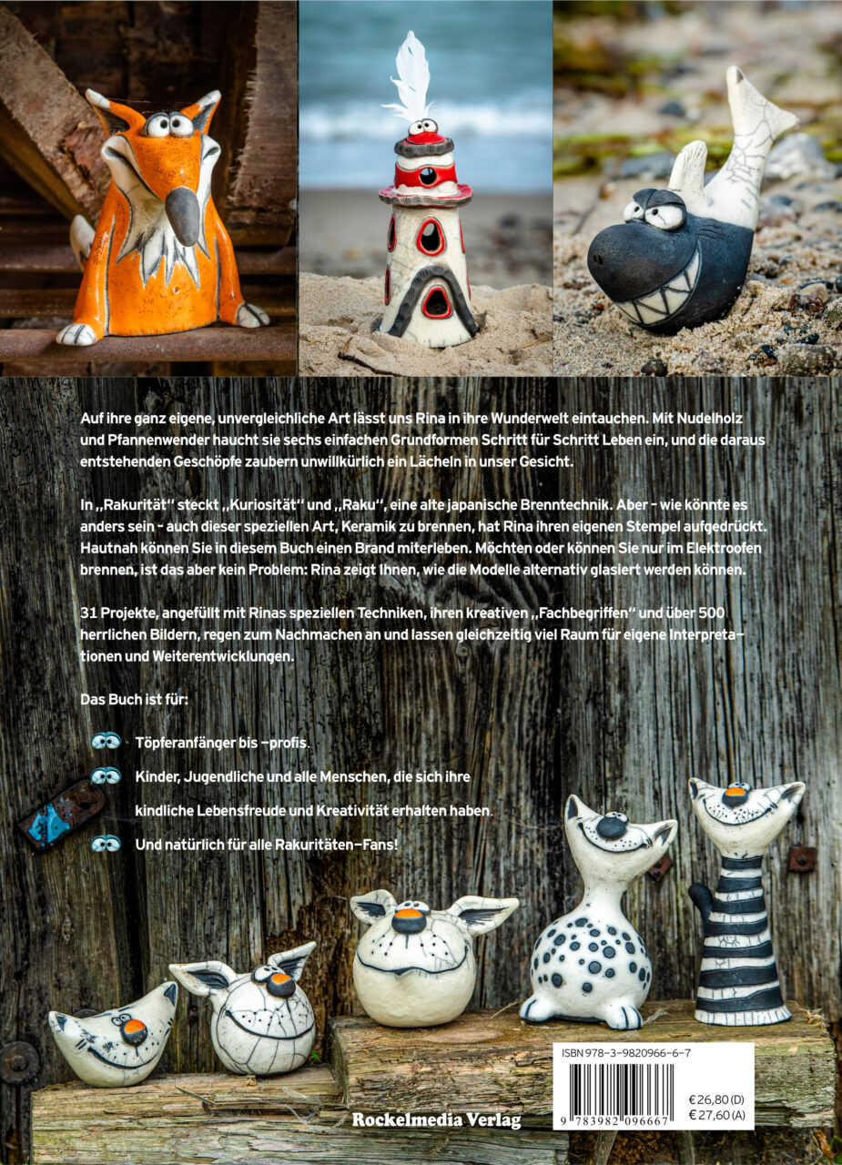 In „Rakurität“ steckt „Kuriosität“ und „Raku“, eine alte japanische Brenntechnik. Aber – wie könnte es anders sein – auch dieser speziellen Art, Keramik zu brennen, hat Rina ihren eigenen Stempel aufgedrückt. Hautnah können Sie in diesem Buch einen Brand miterleben. Möchten oder können Sie nur im Elektroofen brennen, ist das aber kein Problem: Rina zeigt Ihnen, wie die Modelle alternativ glasiert werden können.